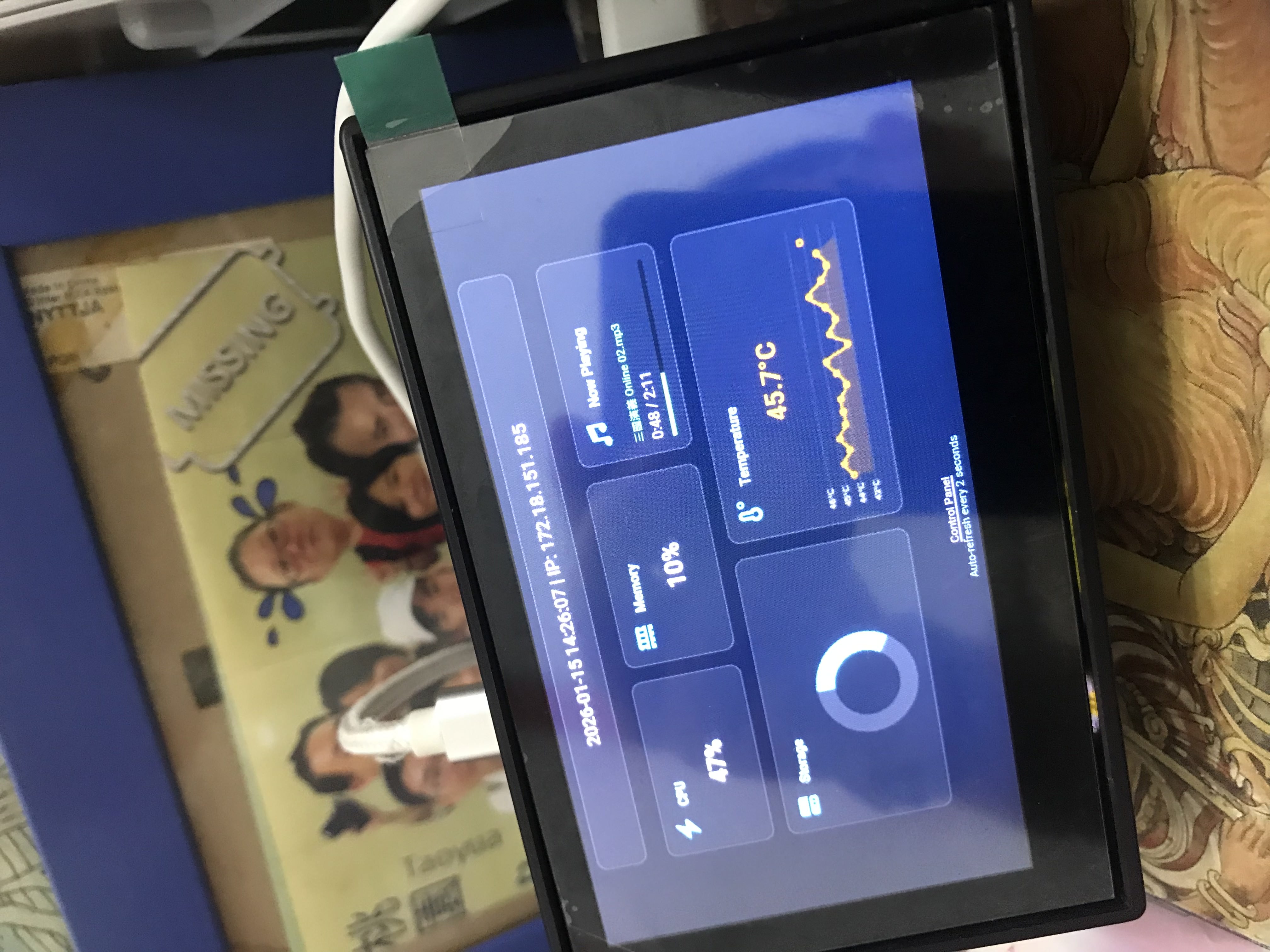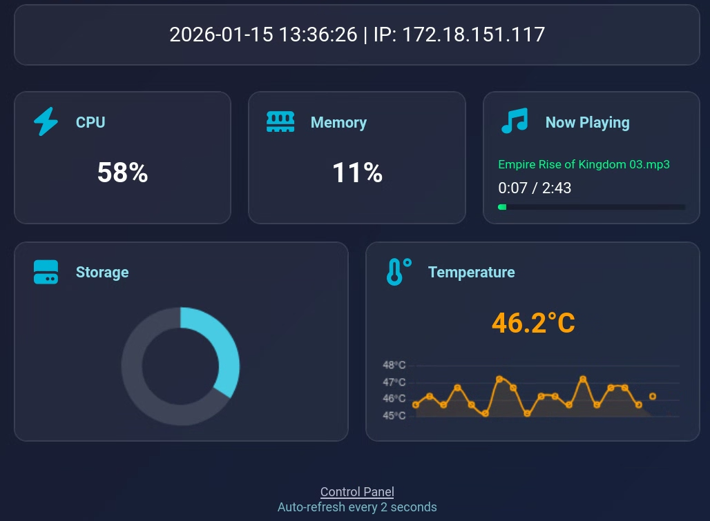 如果没有视频或照片播放时,屏幕上会显示一个仪表板,展示基本的设备信息,还有一个小型音乐卡,显示当前正在播放的音乐。